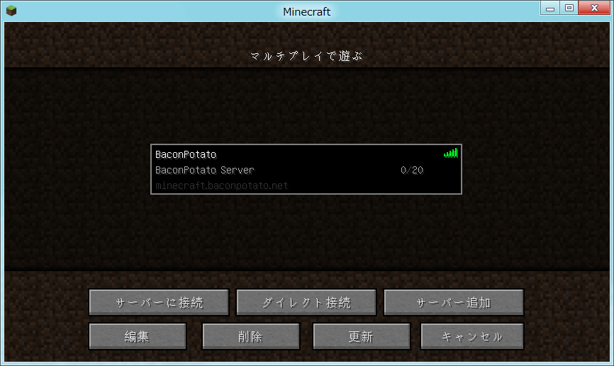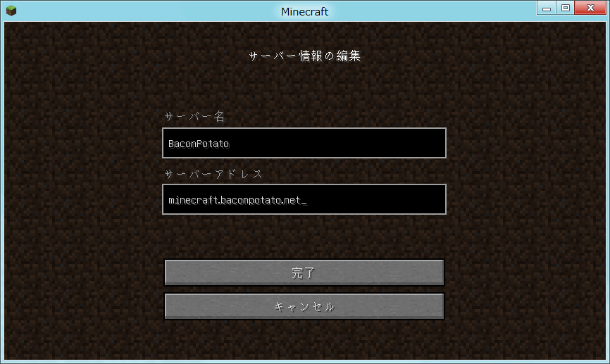 サーバー名に任意の名前(例:BaconPotato)、サーバーアドレスに「minecraft.baconpotato.net」を入力する
